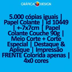 5.000 cópias iguais | Papel Colante | id 10449 | +-7x7cm | Papel Colante Couchê 90g | Meio Corte + Corte Especial | Destaque & Aplique | Impressão FRENTE Colorida apenas | 4x0 cores