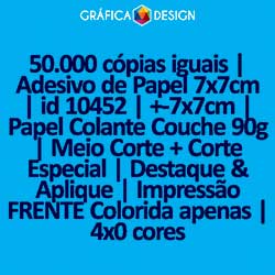 50.000 cópias iguais | Adesivo de Papel 7x7cm | id 10452 | +-7x7cm | Papel Colante Couchê 90g | Meio Corte + Corte Especial | Destaque & Aplique | Impressão FRENTE Colorida apenas | 4x0 cores