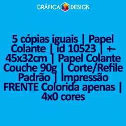 5 cópias iguais | Papel Colante | id 10523 | +-45x32cm | Papel Colante Couchê 90g | Impressão FRENTE Colorida apenas | 4x0 cores