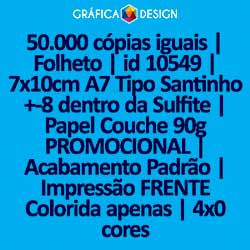 50.000 cópias iguais | Folheto | id 10549 | 7x10cm A7 Tipo Santinho +-8 dentro da Sulfite | Papel Couchê 90g PROMOCIONAL | Impressão FRENTE Colorida apenas | 4x0 cores