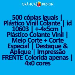 500 cópias iguais | Plástico Vinil Colante | id 10603 | +-4x5cm | Plástico Colante Vinil | Meio Corte + Corte Especial | Destaque & Aplique | Impressão FRENTE Colorida apenas | 4x0 cores