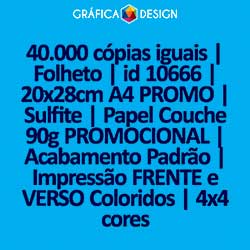 40.000 cópias iguais | Folheto | id 10666 | 20x28cm A4 PROMO | Sulfite | Papel Couchê 90g PROMOCIONAL | Impressão FRENTE e VERSO Coloridos | 4x4 cores
