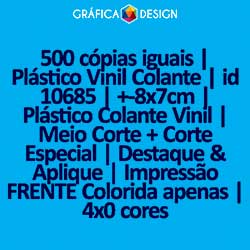 500 cópias iguais | Plástico Vinil Colante | id 10685 | +-8x7cm | Plástico Colante Vinil | Meio Corte + Corte Especial | Destaque & Aplique | Impressão FRENTE Colorida apenas | 4x0 cores