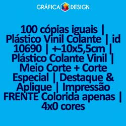 100 cópias iguais | Plástico Vinil Colante | id 10690 | +-10x5,5cm | Plástico Colante Vinil | Meio Corte + Corte Especial | Destaque & Aplique | Impressão FRENTE Colorida apenas | 4x0 cores