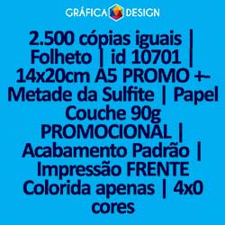 2.500 cópias iguais | Folheto | id 10701 | 14x20cm A5 PROMO +-Metade da Sulfite | Papel Couchê 90g PROMOCIONAL | Impressão FRENTE Colorida apenas | 4x0 cores