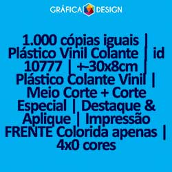 1.000 cópias iguais | Plástico Vinil Colante | id 10777 | +-30x8cm | Plástico Colante Vinil | Meio Corte + Corte Especial | Destaque & Aplique | Impressão FRENTE Colorida apenas | 4x0 cores