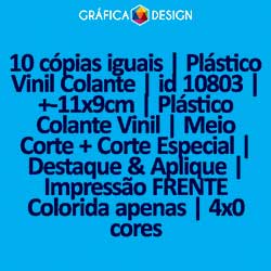 10 cópias iguais | Plástico Vinil Colante | id 10803 | +-11x9cm | Plástico Colante Vinil | Meio Corte + Corte Especial | Destaque & Aplique | Impressão FRENTE Colorida apenas | 4x0 cores