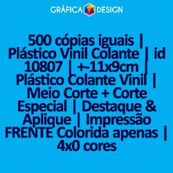 500 cópias iguais | Plástico Vinil Colante | id 10807 | +-11x9cm | Plástico Colante Vinil | Meio Corte + Corte Especial | Destaque & Aplique | Impressão FRENTE Colorida apenas | 4x0 cores