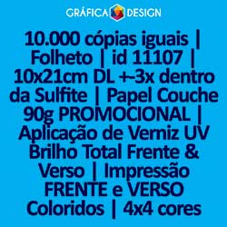 10.000 cópias iguais | Folheto | id 11107 | 10x21cm DL +-3x dentro da Sulfite | Papel Couchê 90g PROMOCIONAL | Aplicação de Verniz UV Brilho Total Frente & Verso | Impressão FRENTE e VERSO Coloridos | 4x4 cores