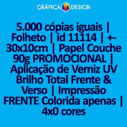 5.000 cópias iguais | Folheto | id 11114 | +-30x10cm | Papel Couchê 90g PROMOCIONAL | Aplicação de Verniz UV Brilho Total Frente & Verso | Impressão FRENTE Colorida apenas | 4x0 cores