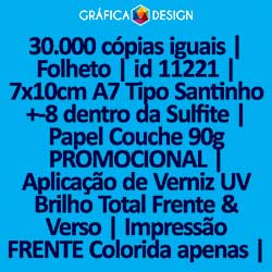 30.000 cópias iguais | Folheto | id 11221 | 7x10cm A7 Tipo Santinho +-8 dentro da Sulfite | Papel Couchê 90g PROMOCIONAL | Aplicação de Verniz UV Brilho Total Frente & Verso | Impressão FRENTE Colorida apenas | 4x0 cores