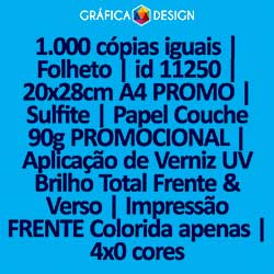 1.000 cópias iguais | Folheto | id 11250 | 20x28cm A4 PROMO | Sulfite | Papel Couchê 90g PROMOCIONAL | Aplicação de Verniz UV Brilho Total Frente & Verso | Impressão FRENTE Colorida apenas | 4x0 cores