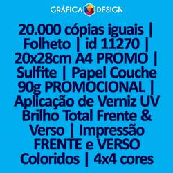 20.000 cópias iguais | Folheto | id 11270 | 20x28cm A4 PROMO | Sulfite | Papel Couchê 90g PROMOCIONAL | Aplicação de Verniz UV Brilho Total Frente & Verso | Impressão FRENTE e VERSO Coloridos | 4x4 cores