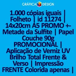 1.000 cópias iguais | Folheto | id 11274 | 14x20cm A5 PROMO +-Metade da Sulfite | Papel Couchê 90g PROMOCIONAL | Aplicação de Verniz UV Brilho Total Frente & Verso | Impressão FRENTE Colorida apenas | 4x0 cores