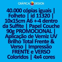 40.000 cópias iguais | Folheto | id 11320 | 10x15cm A6 +-4 dentro da Sulfite | Papel Couchê 90g PROMOCIONAL | Aplicação de Verniz UV Brilho Total Frente & Verso | Impressão FRENTE e VERSO Coloridos | 4x4 cores