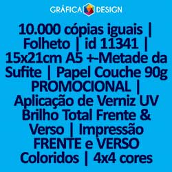 10.000 cópias iguais | Folheto | id 11341 | 15x21cm A5 +-Metade da Sulfite | Papel Couchê 90g PROMOCIONAL | Aplicação de Verniz UV Brilho Total Frente & Verso | Impressão FRENTE e VERSO Coloridos | 4x4 cores
