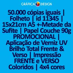 50.000 cópias iguais | Folheto | id 11345 | 15x21cm A5 +-Metade da Sulfite | Papel Couchê 90g PROMOCIONAL | Aplicação de Verniz UV Brilho Total Frente & Verso | Impressão FRENTE e VERSO Coloridos | 4x4 cores