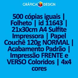 500 cópias iguais | Folheto | id 11643 | 21x30cm A4 Sulfite Impressora | Papel Couchê 120g NORMAL | Impressão FRENTE e VERSO Coloridos | 4x4 cores