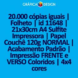 20.000 cópias iguais | Folheto | id 11648 | 21x30cm A4 Sulfite Impressora | Papel Couchê 120g NORMAL | Impressão FRENTE e VERSO Coloridos | 4x4 cores