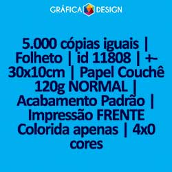 5.000 cópias iguais | Folheto | id 11808 | +-30x10cm | Papel Couchê 120g NORMAL | Impressão FRENTE Colorida apenas | 4x0 cores