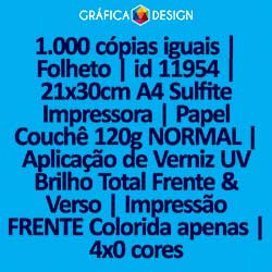 1.000 cópias iguais | Folheto | id 11954 | 21x30cm A4 Sulfite Impressora | Papel Couchê 120g NORMAL | Aplicação de Verniz UV Brilho Total Frente & Verso | Impressão FRENTE Colorida apenas | 4x0 cores