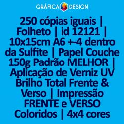 E-mail LUIZ@GRAFICA.DESIGN250 cópias iguais | Folheto | id 12121 | 10x15cm A6 +-4 dentro da Sulfite | Papel Couchê 150g Padrão MELHOR | Aplicação de Verniz UV Brilho Total Frente & Verso | Impressão FRENTE e VERSO Coloridos | 4x4 cores