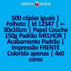 500 cópias iguais | Folheto | id 12347 | +-30x10cm | Papel Couchê 150g Padrão MELHOR | Impressão FRENTE Colorida apenas | 4x0 cores