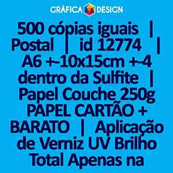 500 cópias iguais | Postal | id 12774 | 10x15cm A6 +-4 dentro da Sulfite | Papel Couchê 250g PAPEL CARTÃO + BARATO | Aplicação de Verniz UV Brilho Total Apenas na Frente | Impressão FRENTE e VERSO Coloridos | 4x4 cores