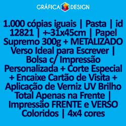 1.000 cópias iguais | Pasta | id 12821 | +-31x45cm | Papel Supremo 300g + METALIZADO Verso Ideal para Escrever | Bolsa c/ Impressão Personalizada + Corte Especial + Encaixe Cartão de Visita + Aplicação de Verniz UV Brilho Total Apenas na Frente | Imp