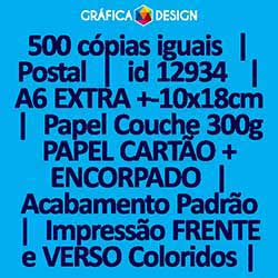500 cópias iguais | Postal | id 12934 | 18x10cm A6 EXTRA | DL Reduzido | Papel Couchê 300g PAPEL CARTÃO + ENCORPADO | Impressão FRENTE e VERSO Coloridos | 4x4 cores