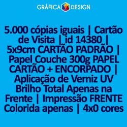5.000 cópias iguais | Cartão de Visita | id 14380 | 5x9cm CARTÃO PADRÃO | Papel Couchê 300g PAPEL CARTÃO + ENCORPADO | Aplicação de Verniz UV Brilho Total Apenas na Frente | Impressão FRENTE Colorida apenas | 4x0 cores