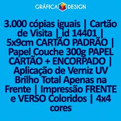 3.000 cópias iguais | Cartão de Visita | id 14401 | 5x9cm CARTÃO PADRÃO | Papel Couchê 300g PAPEL CARTÃO + ENCORPADO | Aplicação de Verniz UV Brilho Total Apenas na Frente | Impressão FRENTE e VERSO Coloridos | 4x4 cores