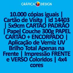 10.000 cópias iguais | Cartão de Visita | id 14403 | 5x9cm CARTÃO PADRÃO | Papel Couchê 300g PAPEL CARTÃO + ENCORPADO | Aplicação de Verniz UV Brilho Total Apenas na Frente | Impressão FRENTE e VERSO Coloridos | 4x4 cores