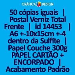 50 cópias iguais | Postal Verniz Total Frente | id 14453 | 10x15cm A6 +-4 dentro da Sulfite | Papel Couchê 300g PAPEL CARTÃO + ENCORPADO | Impressão FRENTE Colorida apenas | 4x0 cores