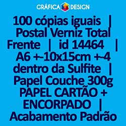 100 cópias iguais | Postal Verniz Total Frente | id 14464 | 10x15cm A6 +-4 dentro da Sulfite | Papel Couchê 300g PAPEL CARTÃO + ENCORPADO | Impressão FRENTE e VERSO Coloridos | 4x4 cores