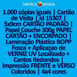 1.000 cópias iguais | Cartão de Visita | id 15307 | 5x9cm CARTÃO PADRÃO | Papel Couchê 300g PAPEL CARTÃO + ENCORPADO | Laminação Plástica BOPP Fosca + Aplicaçao de VERNIZ UV Localizado + Cantos Redondos | Impressão FRENTE e VERSO Coloridos | 4x4 cores