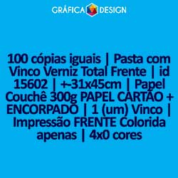 100 cópias iguais | Pasta com Vinco Verniz Total Frente | id 15602 | +-31x45cm | Papel Couchê 300g PAPEL CARTÃO + ENCORPADO | 1 (um) Vinco | Impressão FRENTE Colorida apenas | 4x0 cores