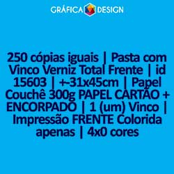 250 cópias iguais | Pasta com Vinco Verniz Total Frente | id 15603 | +-31x45cm | Papel Couchê 300g PAPEL CARTÃO + ENCORPADO | 1 (um) Vinco | Impressão FRENTE Colorida apenas | 4x0 cores