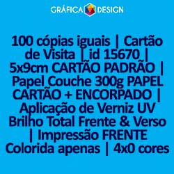 100 cópias iguais | Cartão de Visita | id 15670 | 5x9cm CARTÃO PADRÃO | Papel Couchê 300g PAPEL CARTÃO + ENCORPADO | Aplicação de Verniz UV Brilho Total Frente & Verso | Impressão FRENTE Colorida apenas | 4x0 cores