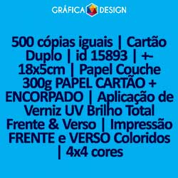 500 cópias iguais | Cartão Duplo | id 15893 | +-18x5cm | Papel Couchê 300g PAPEL CARTÃO + ENCORPADO | Aplicação de Verniz UV Brilho Total Frente & Verso | Impressão FRENTE e VERSO Coloridos | 4x4 cores