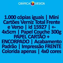 1.000 cópias iguais | Mini Cartões Verniz Total Frente e Verso | id 15927 | +-4x5cm | Papel Couchê 300g PAPEL CARTÃO + ENCORPADO | Impressão FRENTE Colorida apenas | 4x0 cores