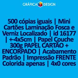 500 cópias iguais | Mini Cartões Laminação Fosca e Verniz Localizado | id 16177 | +-4x5cm | Papel Couchê 300g PAPEL CARTÃO + ENCORPADO | Impressão FRENTE Colorida apenas | 4x0 cores