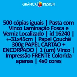 500 cópias iguais | Pasta com Vinco Laminação Fosca e Verniz Localizado | id 16240 | +-31x45cm | Papel Couchê 300g PAPEL CARTÃO + ENCORPADO | 1 (um) Vinco | Impressão FRENTE Colorida apenas | 4x0 cores