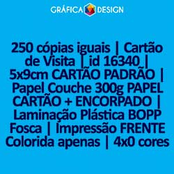 250 cópias iguais | Cartão de Visita | id 16340 | 5x9cm CARTÃO PADRÃO | Papel Couchê 300g PAPEL CARTÃO + ENCORPADO | Laminação Plástica BOPP Fosca | Impressão FRENTE Colorida apenas | 4x0 cores