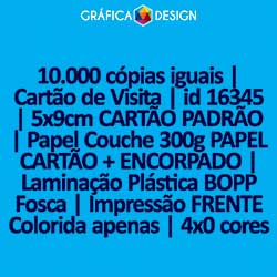 10.000 cópias iguais | Cartão de Visita | id 16345 | 5x9cm CARTÃO PADRÃO | Papel Couchê 300g PAPEL CARTÃO + ENCORPADO | Laminação Plástica BOPP Fosca | Impressão FRENTE Colorida apenas | 4x0 cores