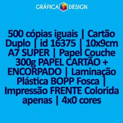 500 cópias iguais | Cartão Duplo | id 16375 | 10x9cm A7 SUPER | Papel Couchê 300g PAPEL CARTÃO + ENCORPADO | Laminação Plástica BOPP Fosca | Impressão FRENTE Colorida apenas | 4x0 cores