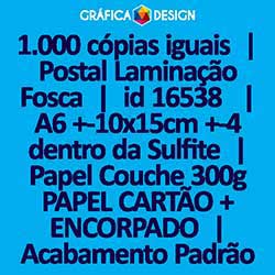 1.000 cópias iguais | Postal Laminação Fosca | id 16538 | 10x15cm A6 +-4 dentro da Sulfite | Papel Couchê 300g PAPEL CARTÃO + ENCORPADO | Impressão FRENTE Colorida apenas | 4x0 cores