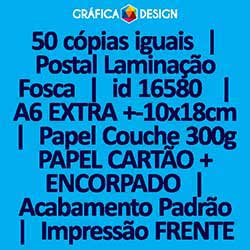 50 cópias iguais | Postal Laminação Fosca | id 16580 | 18x10cm A6 EXTRA | DL Reduzido | Papel Couchê 300g PAPEL CARTÃO + ENCORPADO | Impressão FRENTE e VERSO Coloridos | 4x4 cores