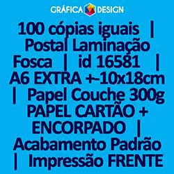 100 cópias iguais | Postal Laminação Fosca | id 16581 | 18x10cm A6 EXTRA | DL Reduzido | Papel Couchê 300g PAPEL CARTÃO + ENCORPADO | Impressão FRENTE e VERSO Coloridos | 4x4 cores