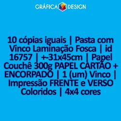10 cópias iguais | Pasta com Vinco Laminação Fosca | id 16757 | +-31x45cm | Papel Couchê 300g PAPEL CARTÃO + ENCORPADO | 1 (um) Vinco | Impressão FRENTE e VERSO Coloridos | 4x4 cores